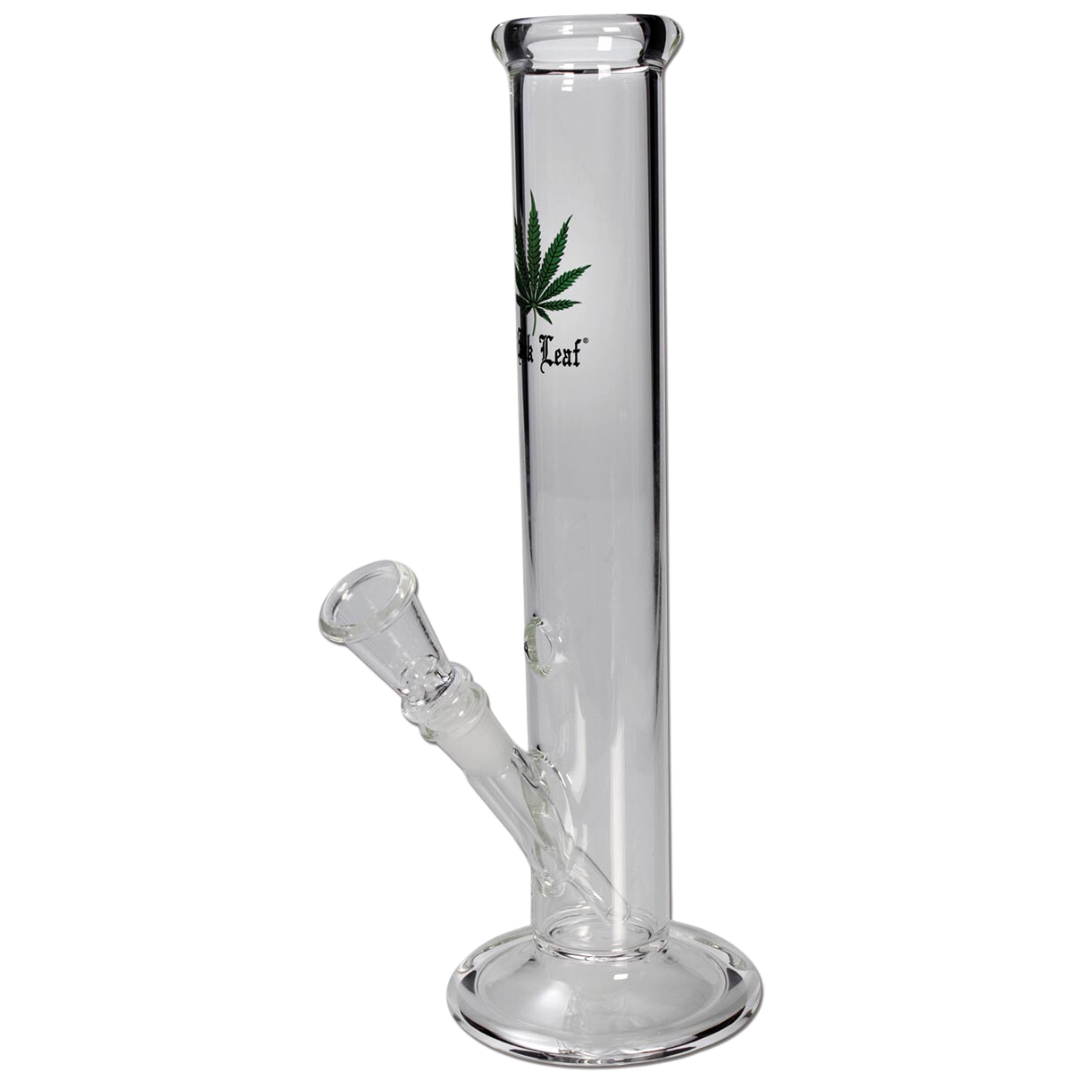 Meget elegant bong lavet af borosilikatglas med hampbladmotiv, Sliphul, rund bund og lige cylinder. Inkl glashoved!