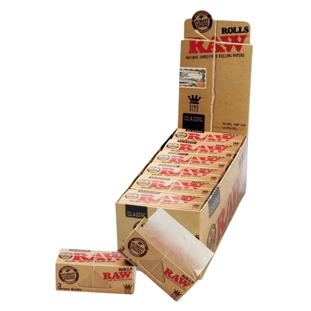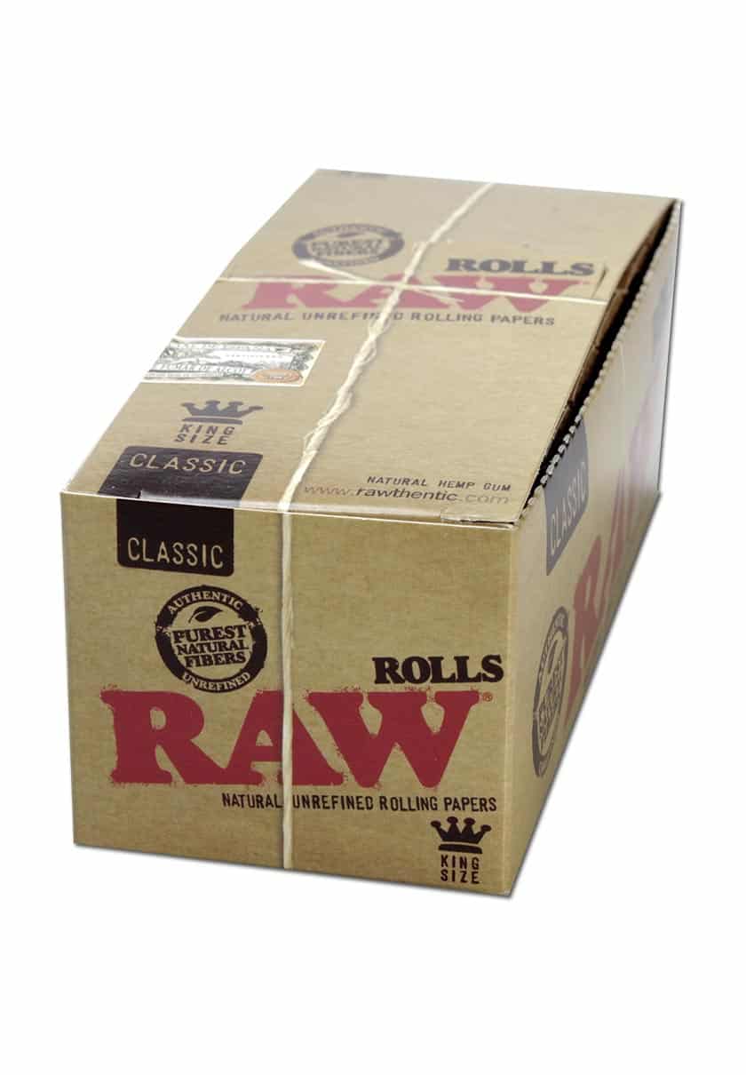 RAW' Ruller - cigaretpapir i en strækning - lavet af rå, organiske og ublegede naturfibre. De tre meter lange ruller leveres med 12 stk i en displayboks.