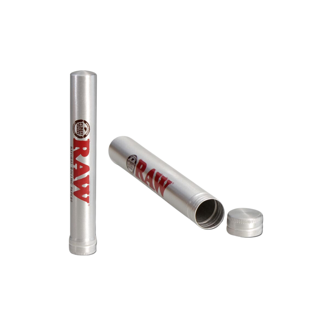 RAW® Metalrør til cigaret – æsken lavet af stærkt aluminium i retrostil til opbevaring af den forrullede King Size cigaret på farten! Den er efterlignet fra det antikke cigarrør og beskytter mod lugt takket være kork-indsatsen i skruelåget.