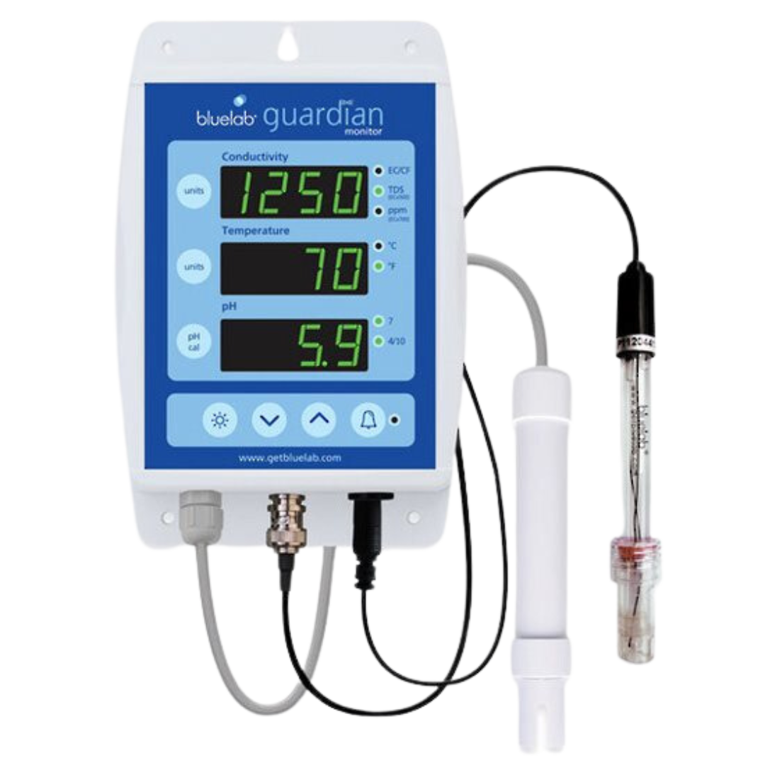 Bluelab Guardian Monitor giver 24 timers kontinuerlig aflæsning for pH, ledningsevne (EC / ppm 700 / TDS / CF) og temperatur i en næringsopløsning.