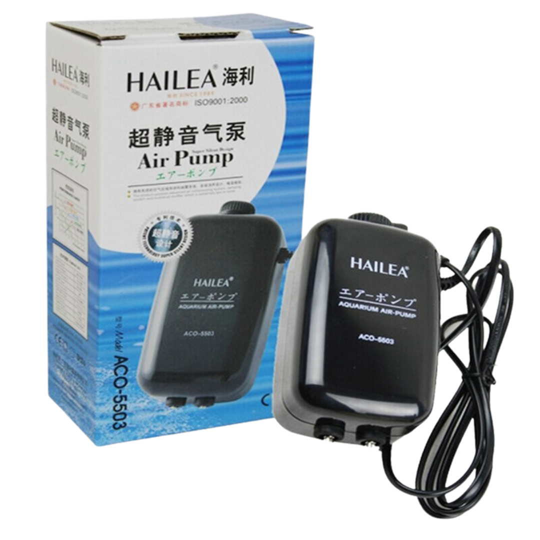 ACO 5503 Luftpumpe med lav støj, dobbeltudgang med variabel ydelse, maksimal ydelse 3,3 ltr / min, maksimal dybde 21 “strømforbrug 4,0 w. Støjniveau; 12 db ved minimumsindstilling 15 db ved maksimumsindstilling, vægt 0,52 kg Velegnet til akvarier op til 48” Lang. Effekt 200 ltr / time